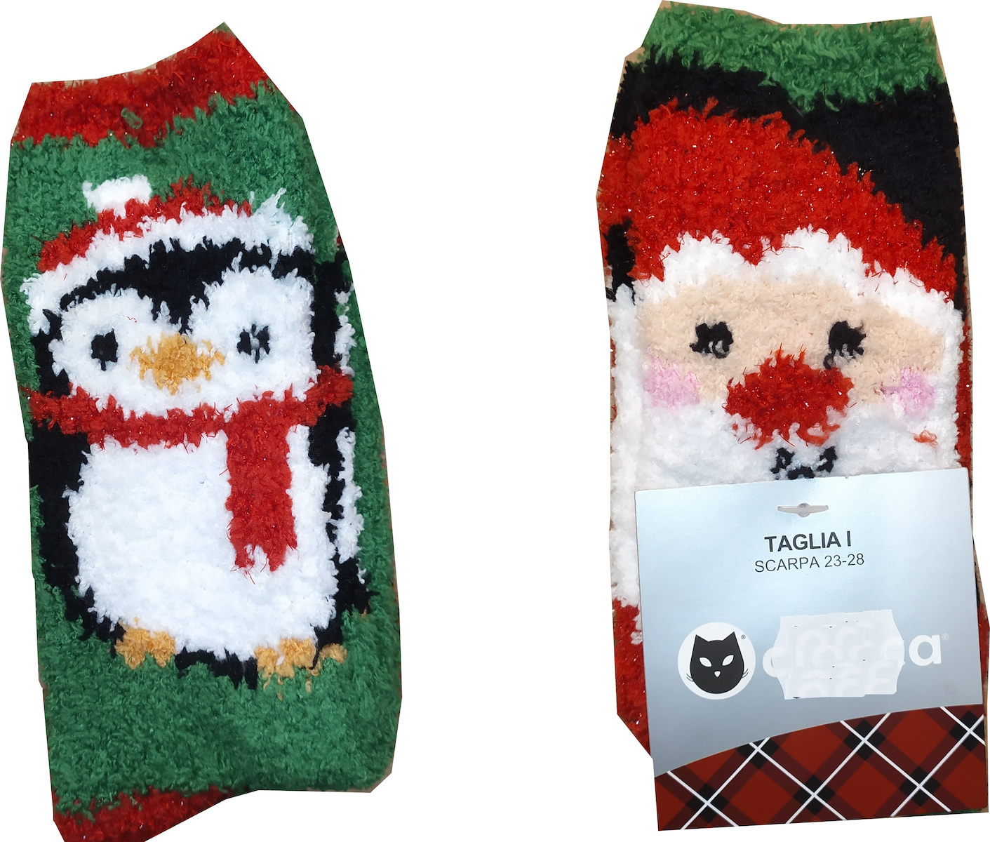 2 ΤΕΜΑΧΙΑ παιδικές χρωματιστές χνουδωτές κάλτσες με σχέδια και πατουσάκια σιλικόνης από κάτω. Μια με τον Άγιο Βασίλη και μια με πιγκουίνο.(98%POLYESTER-2%ELASTANE)