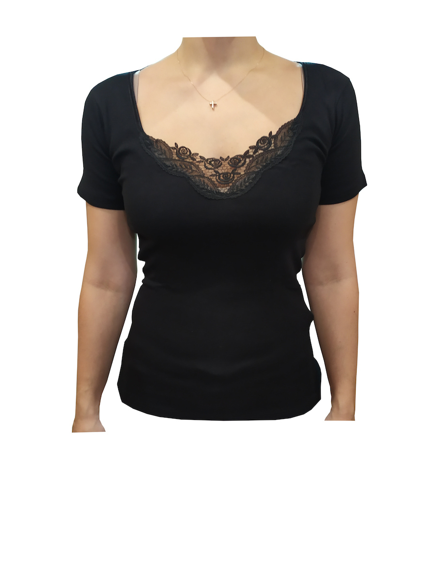 Dreams μαύρο γυναικείο φανελάκι με κοντό μανίκι και δαντέλα.