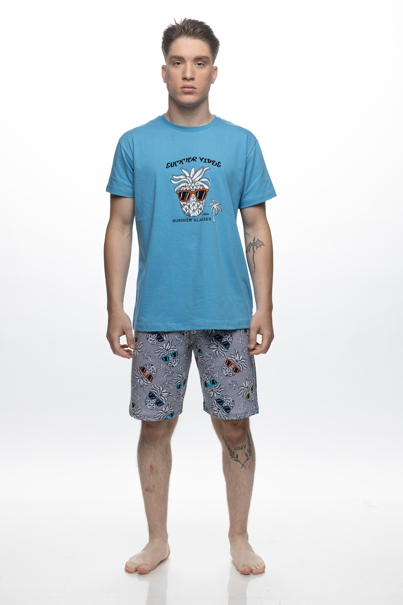Galaxy Βαμβακερή Ανδρική Πιτζάμα Άκουα/Γκρι.