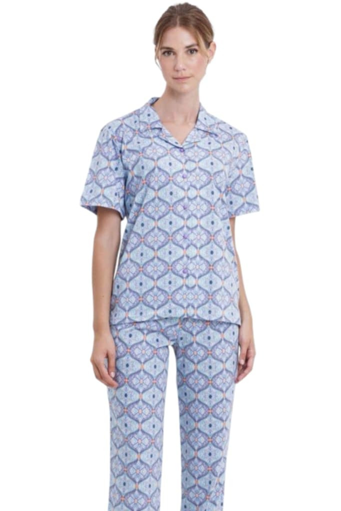 Γιώτα Σιέλ Εμπριμέ Κουμπωτή Γυναικεία Κοντομάνικη Πιτζάμα Με Μακρύ Παντελόνι.