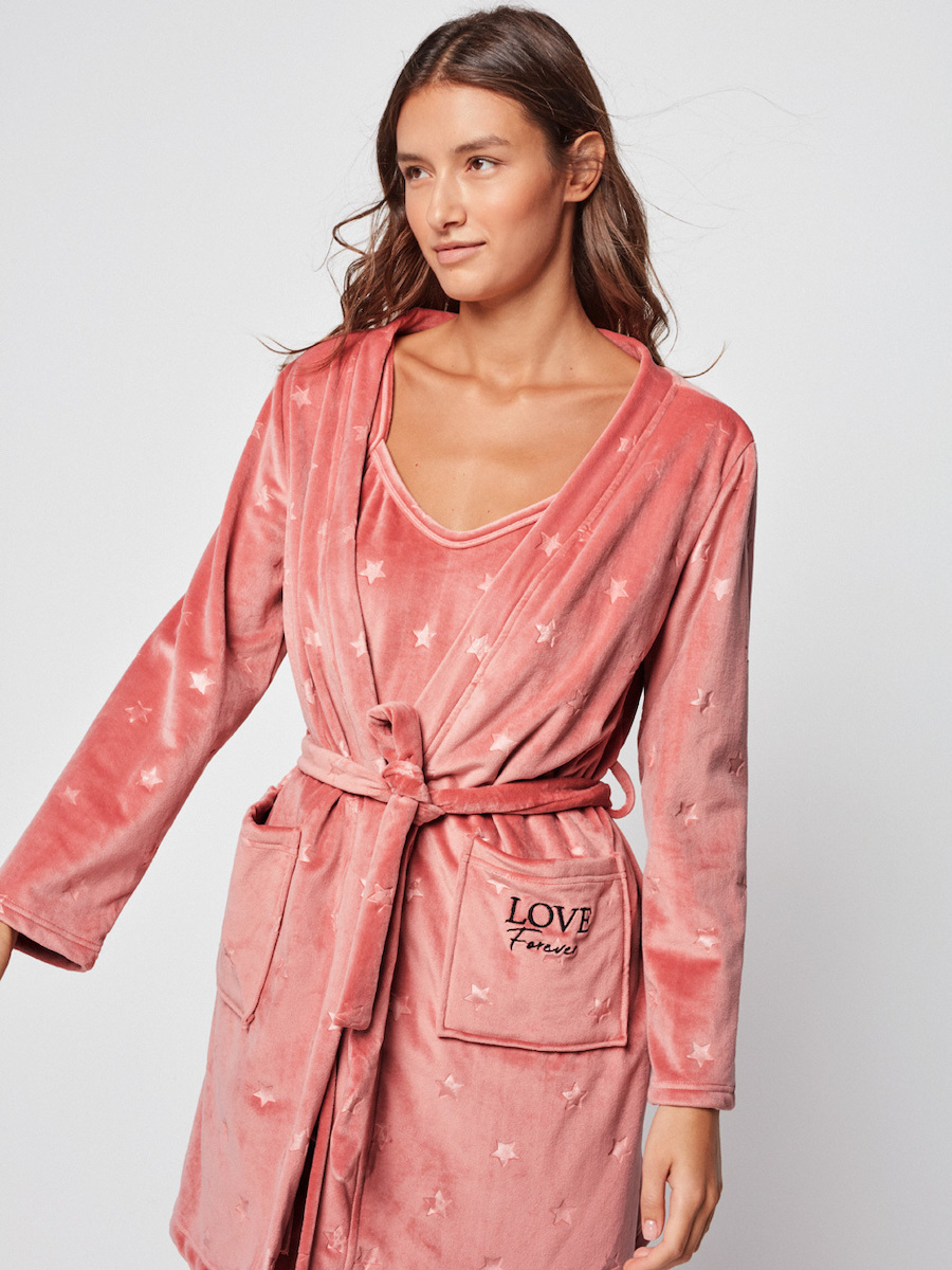 Gisela βελούδινη σομόν σταυρωτή ρόμπα με ανάγλυφα αστέρια.