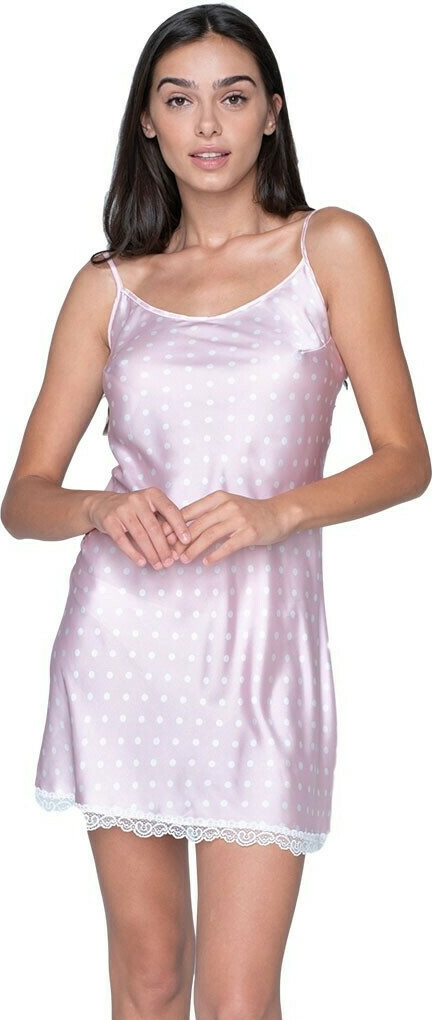 Γυναικείο ροζ σατέν νυχτικό πουά με λεπτομέρειες λευκής δαντέλας και δέσιμο στην πλάτη.