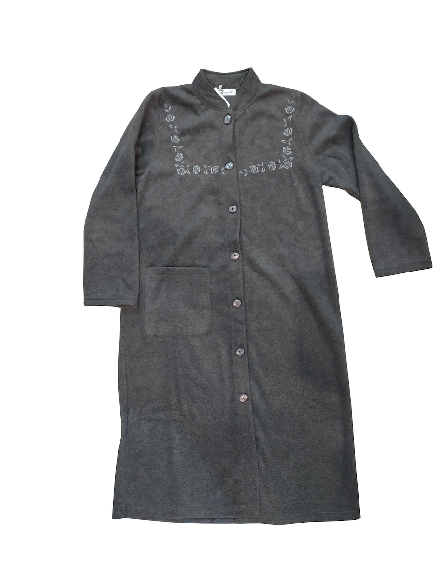 Jeannette ανθρακί κουμπωτή φλις γυναικεία ρόμπα με κέντημα.