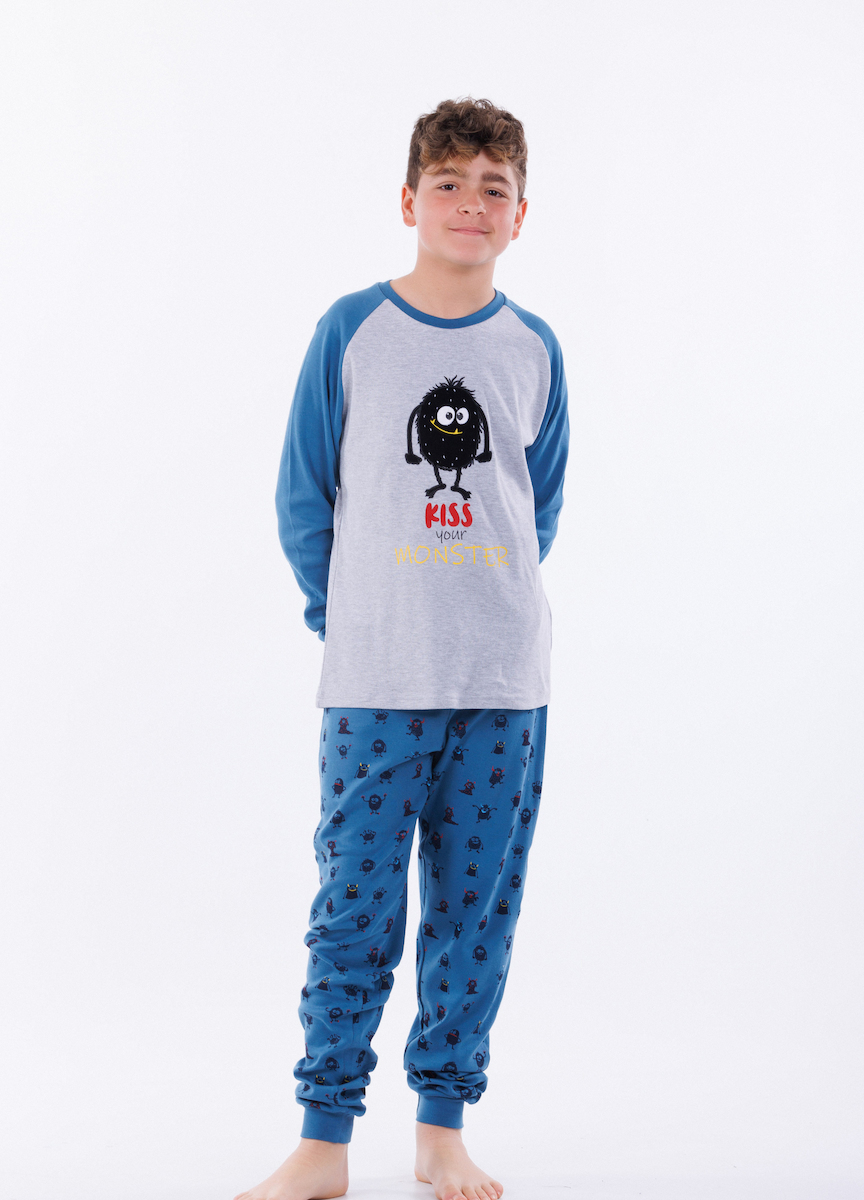 Mei βαμβακερή γκρι/ραφ παιδική πιτζάμα με τέρατα.