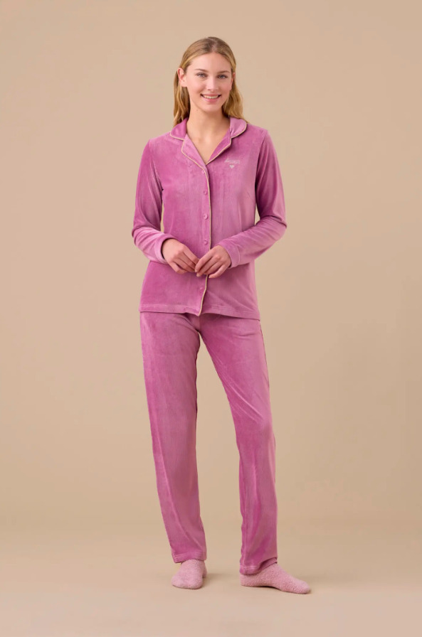 Noidinotte Rib Βελούδινη Κουμπωτή Γυναικεία Πιτζάμα Ροζ.
