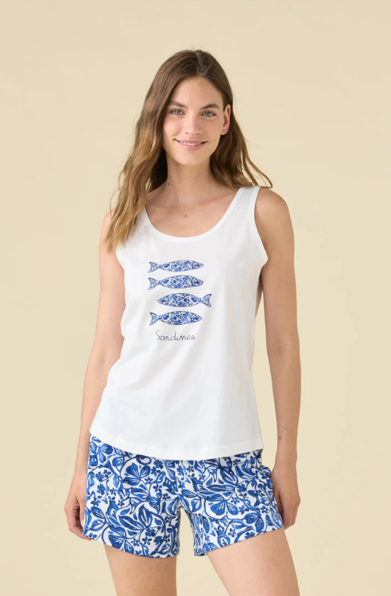 Noidinotte Βαμβακερή Γυναικεία Πιτζάμα Λευκή Με Μπλε Εμπριμέ Σορτς.