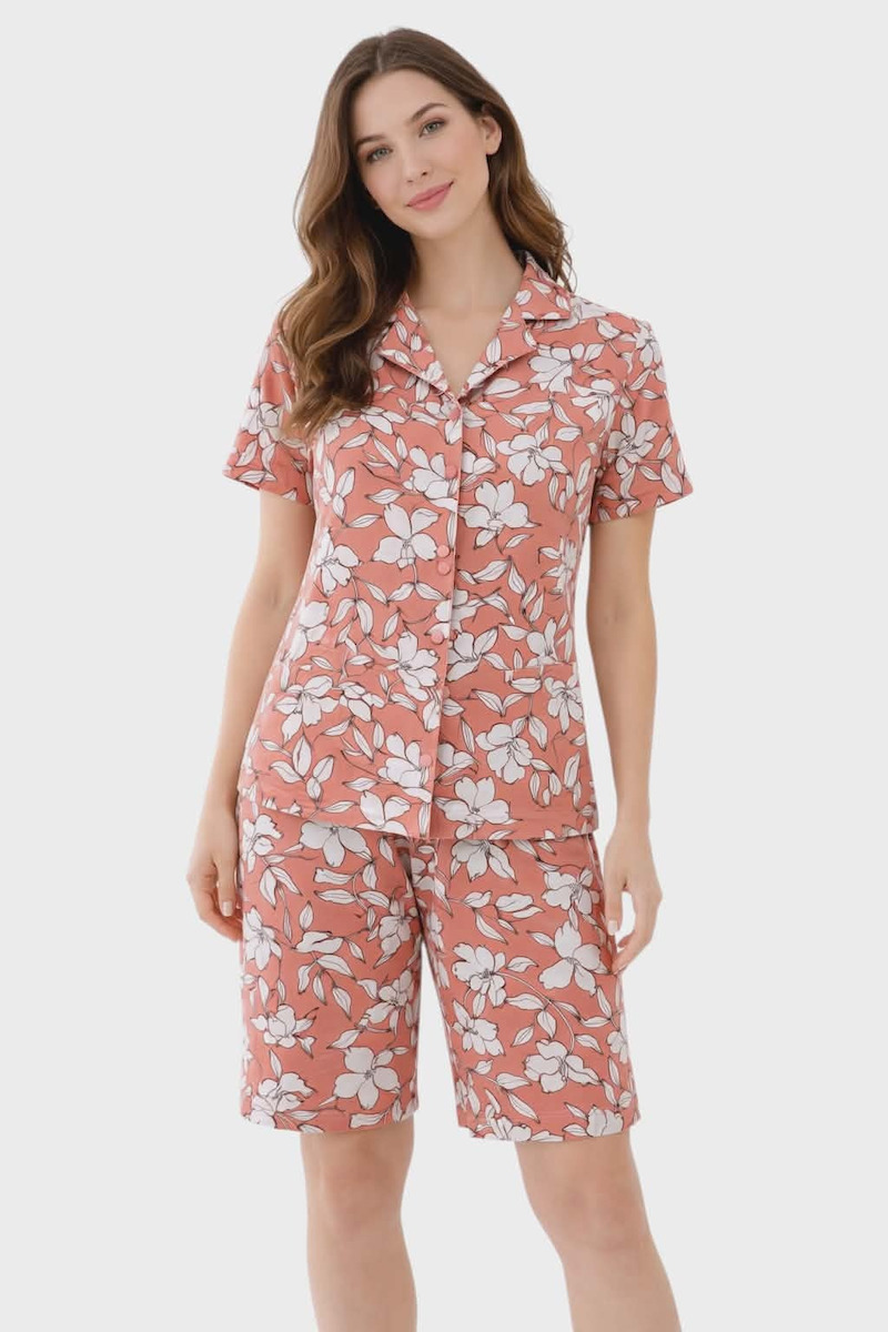 Passion Κεραμιδί Γυναικεία Κουμπωτή Πιτζάμα Φλοράλ Με Βερμούδα.