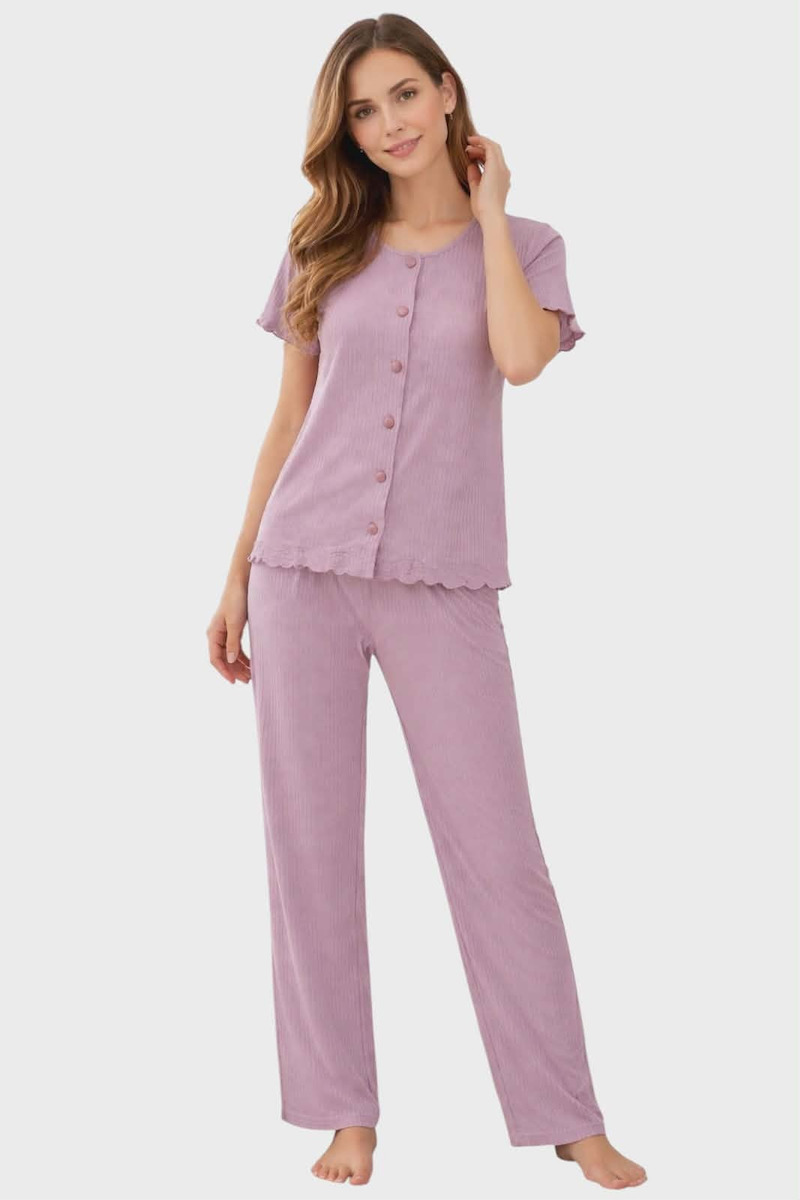 Passion Λιλά Rib Κουμπωτή Γυναικεία Πιτζάμα Με Μακρύ Παντελόνι.