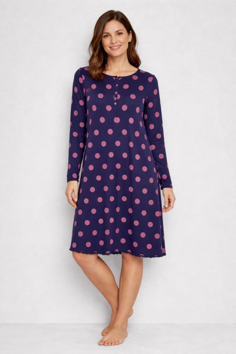 Zen Βαμβακερό Μπλε Πουά Νυχτικό Με 4 Κουμπιά.
