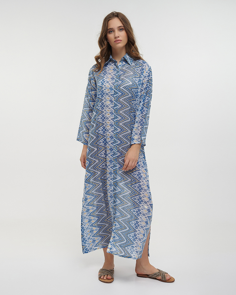 Ble Resort Collection Μπλε/Χρυσό Maxi Κουμπωτό Καφτάνι.