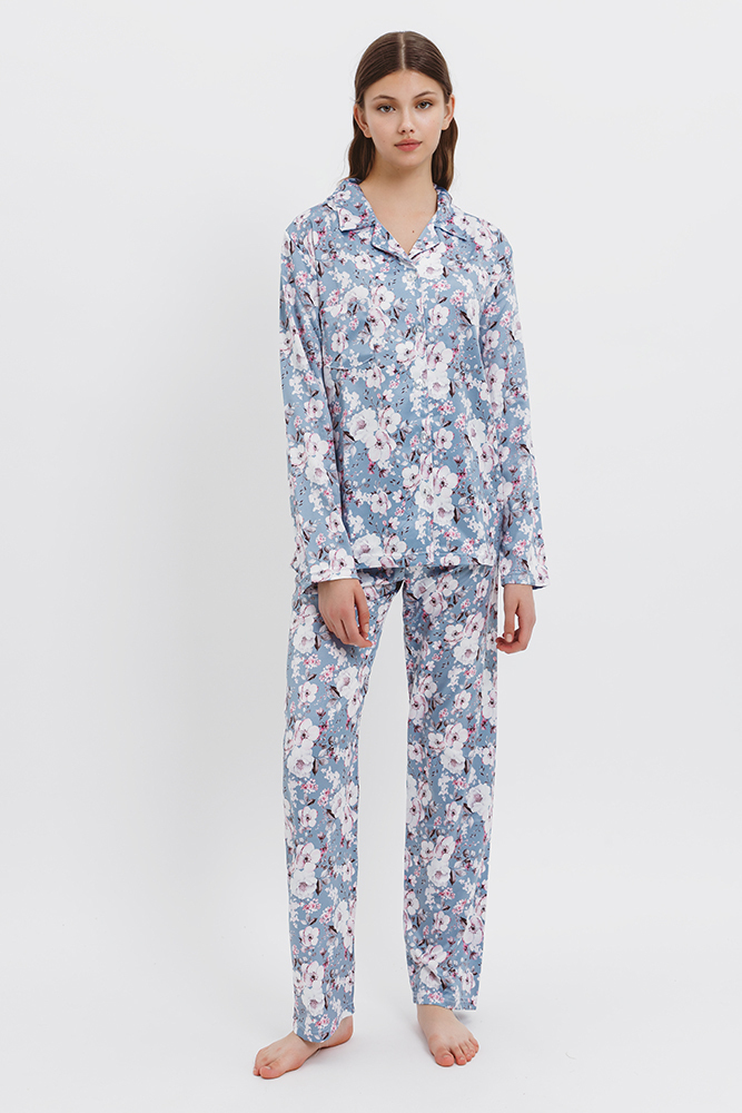 Γιώτα Σατέν Γυναικεία Πιτζάμα Φλοράλ Σιέλ.
