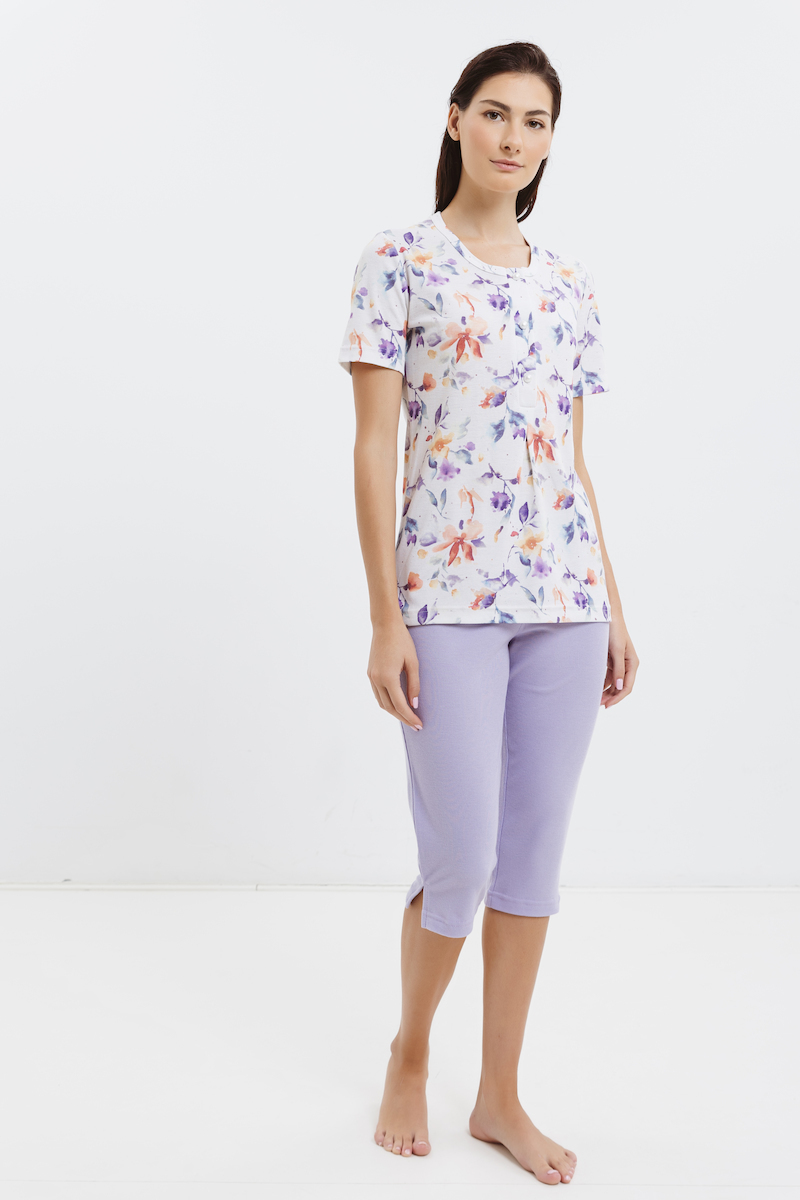 Giota Βαμβακερή Εκρού/Λιλά Κοντομάνικη Πιτζάμα Εμπριμέ Με Κάπρι.