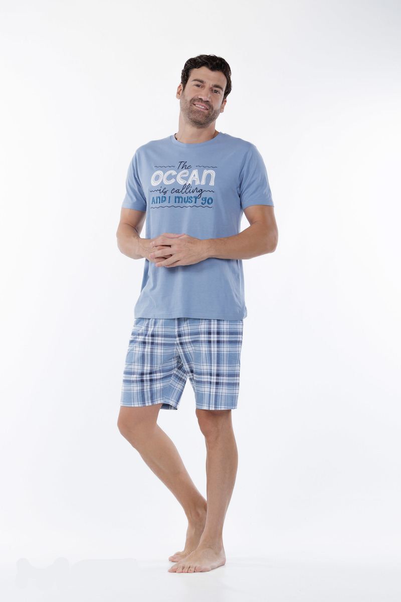 Mei Βαμβακερή Γαλάζια/Καρό Ανδρική Πιτζάμα Με Σορτς.