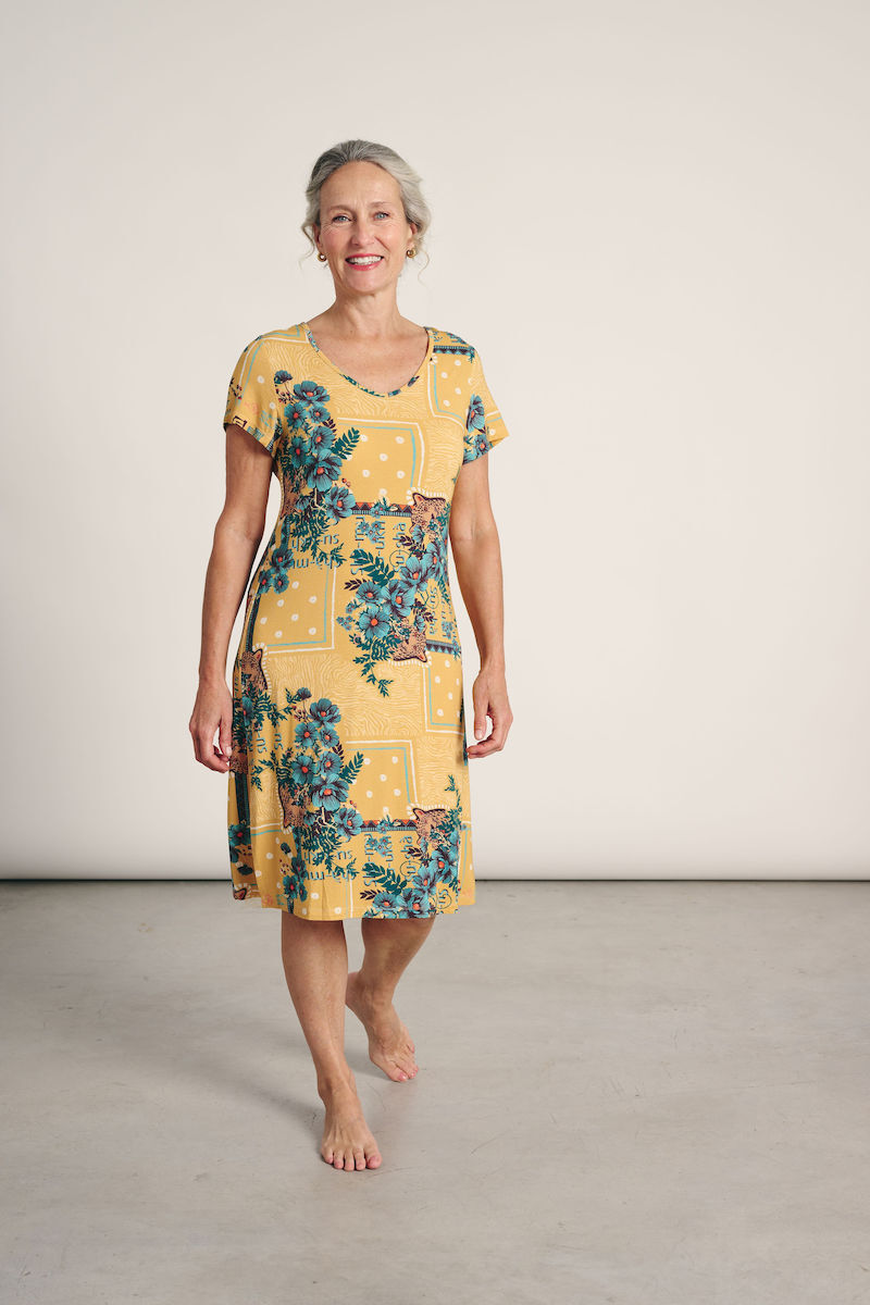 Muydemi Rayon Κίτρινο Κοντομάνικο Φόρεμα Εμπριμέ.