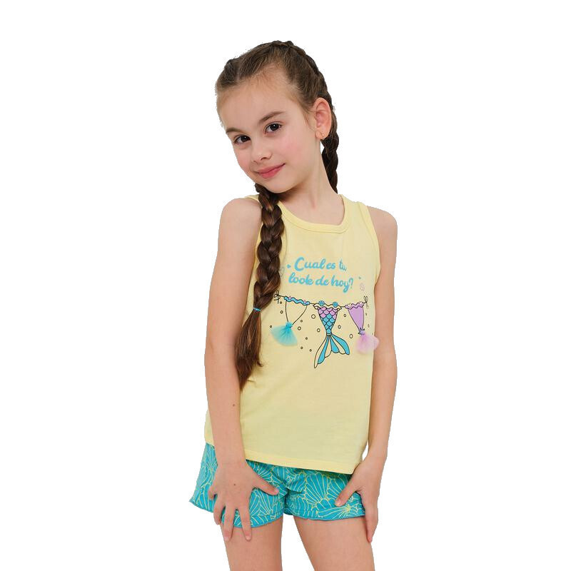 Muydemi βαμβακερή κίτρινη/τιρκουάζ κοριτσίστικη αμάνικη πιτζάμα με εμπριμέ σορτς.
