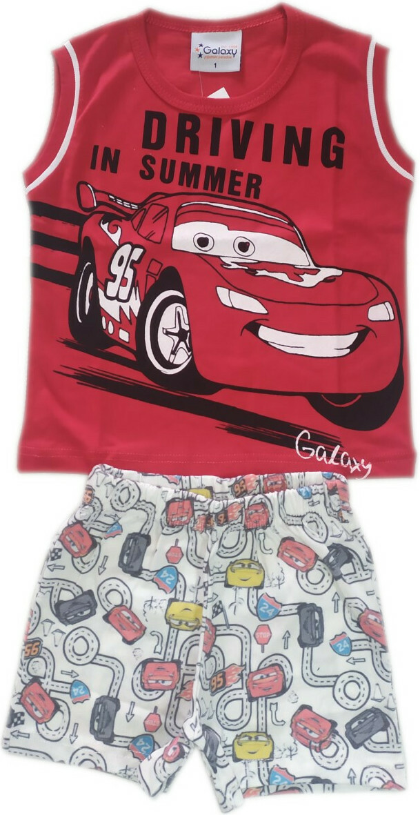 Παιδική αγορίστικη πιτζάμα από 100% βαμβάκι. Κόκκινη αμάνικη μπλούζα με στάμπα. Εμπριμέ σορτς.