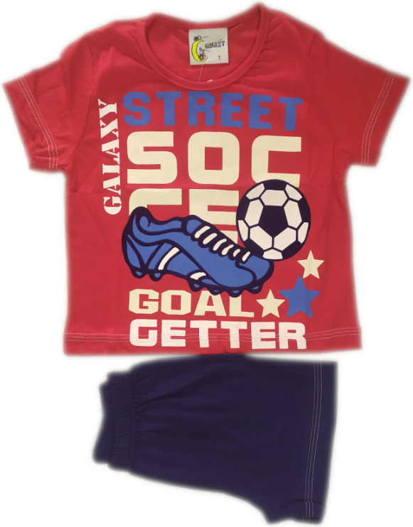 Παιδική αγορίστικη πιτζάμα από 100% βαμβάκι. Κόκκινη μπλούζα με κοντό μανίκι και στάμπα. Μπλε σορτς.