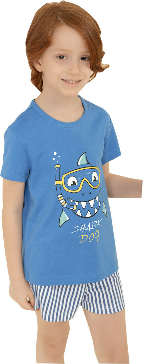 Παιδική αγορίστικη πιτζάμα. Μπλε μπλούζα με κοντό μανίκι και στάμπα. Ριγέ σορτς.