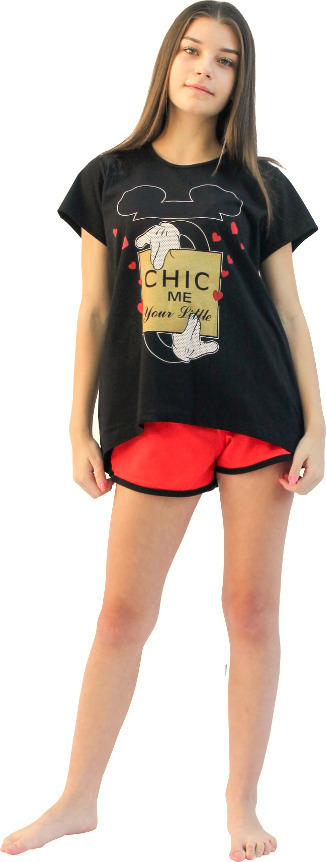 Παιδική κοριτσίστικη πιτζάμα από 100% βαμβάκι. Μαύρη μπλούζα με κοντό μανίκι και στάμπα. Κόκκινο σορτς.
